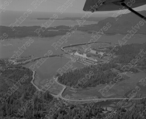 Scope & Content: Item consists of an aerial view of Watson Island, the Columbia Cellulose Pulp Mill, Ridley Island, the entrance to Prince Rupert Harbour and Bilmor, B.C. Handwritten annotation on recto of copy 3 reads: "Bilmore, [sic] B.C. Col. Cellulose Plant. Watson Isl. Ridley Isl. Entrance to Rupert Harbour. 1960." Stamped annotation on verso of copy 3 reads: "Photo by Jack Wrathall Prince Rupert, B. C."