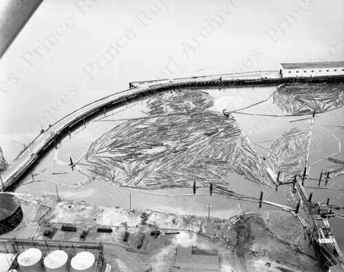 Scope & Content: Item consists of an aerial view of Watson Island including the Columbia Cellulose Pulp Mill and the road to Port Edward. Handwritten annotation on recto of copy 2 reads: "Celgar Plant Wharf. 1961. Watson Isl." Stamped annotation on verso of copies 2 and 3 reads: "Photo by Jack Wrathall Prince Rupert, B. C." Handwritten annotation on recto of copies 3 and 4 reads: "Wharf & Logs - Col. Cellulose Plant. Watson Isl. 1961."