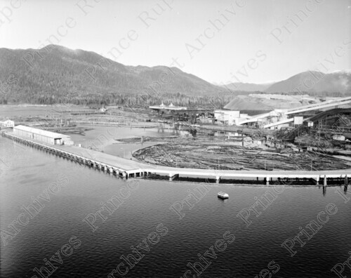 Scope & Content: Item consists of an aerial view of the Columbia Cellulose Pulp Mill on Watson Island. Log booms can be seen floating in the waters around the Island. Handwritten annotation on recto of copy 2 reads: "Col. Cellulose Plant. Watson Isl. 1967." Stamped annotation on verso of copy 2 reads: "Photo by Jack Wrathall Prince Rupert, B. C."