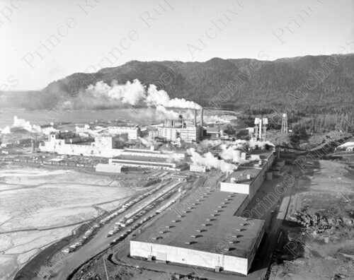 Scope & Content: Item consists of an aerial view of the Columbia Cellulose Pulp Mill on Watson Island. Handwritten annotation on recto of copy 2 reads: "1967. Entrance to Celgar Plant." Handwritten annotation on recto of copy 3 reads: "Col. Cellulose Plant & New Paper Mill. Watson Isl. 1967." Stamped annotation on verso of copies 2 and 3 reads: "Photo by Jack Wrathall Prince Rupert, B. C."