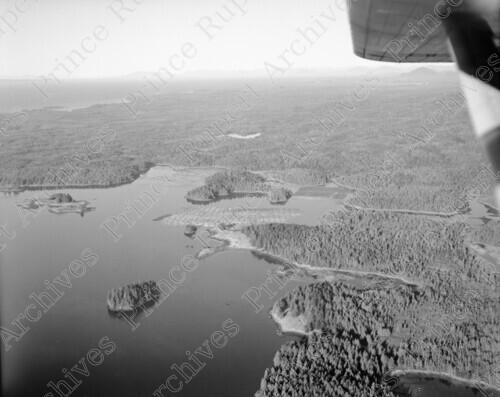 Scope & Content: Item consists of an aerial view of log booms store in Metlakatla Passage. Handwritten annotation on recto of copy 2 reads: "Log Booms - Metlakatla Passage - 1969." Stamped annotation on verso of copy 2 reads: "Photo by Jack Wrathall Prince Rupert, B. C."
