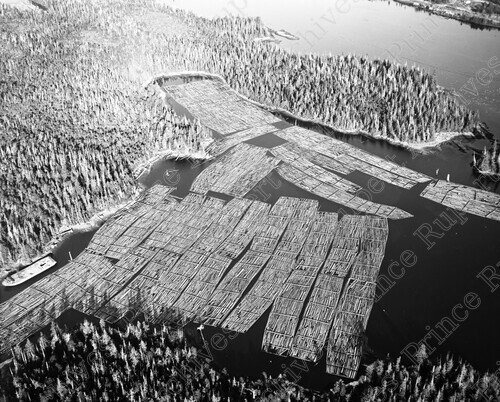 Scope & Content: Item consists of an aerial view of log booms from Columbia Cellulose Pulp Mill stored in Metlakatla Passage. Handwritten annotation on recto of copy 2 reads: "Log Booms - Stored in Metlakatla Passage. 1969." Stamped annotation on verso of copy 2 reads: "Photo by Jack Wrathall Prince Rupert, B. C."
