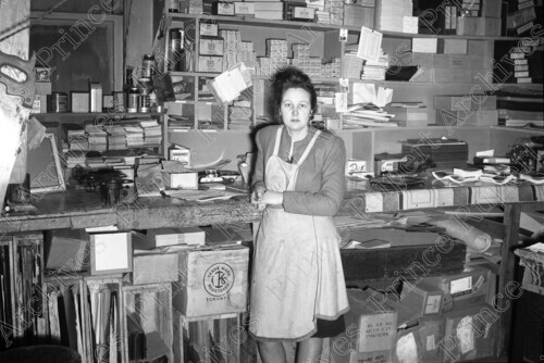 Scope & Content: Item consists of Dorothy (Dot) Fletcher behind standing against shelving in Wrathall's Photo Finishing on the 300 Blk of 3rd Avenue West. Handwritten annotation on recto of copy 2 reads: "Wrathall's Store. 1949. 300 Blk. 3rd. Ave. W. Dot Fletcher." Stamped annotation on verso of copy 2 reads: "Photo by Jack Wrathall Prince Rupert, B. C."