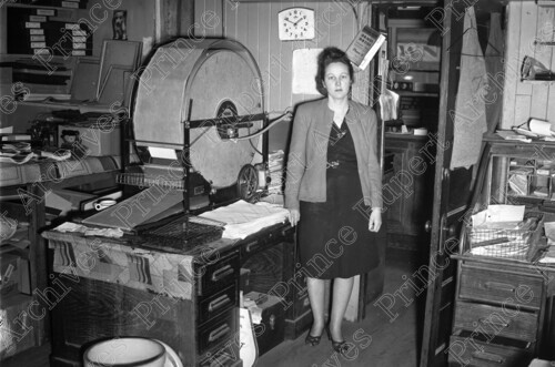 Scope & Content: Item consists of Dorothy (Dot) Fletcher standing beside machinery at Wrathall's Photo Finishing store on 3rd Avenue West. Handwritten annotation on recto of copy 2 reads: "Wrathall's Store. 1949. 300 Blk. 3rd. Ave. W. Dot. Fletcher." Stamped annotation on verso of copy 2 reads: "Photo by Jack Wrathall Prince Rupert, B.C."