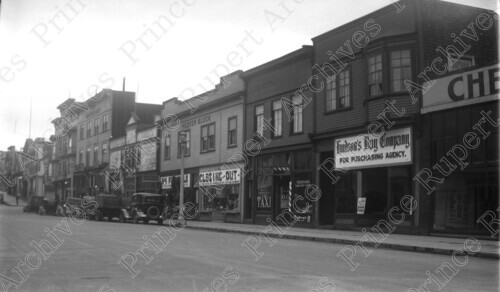 Scope & Content: Item consists of the 700 Block of 3rd Avenue West including a Hudson's Bay Company fur purchasing agency, the 60 Taxi office, Yokohama Barber Shop and Baths and the Meeker Block. Handwritten annotation on recto of copy 3 reads: "700 Blk. 3rd. Ave. W. Prince Rupert." Stamped annotation on verso of copies 2 and 3 reads: "Photo by Jack Wrathall Prince Rupert, B. C. 1930."
