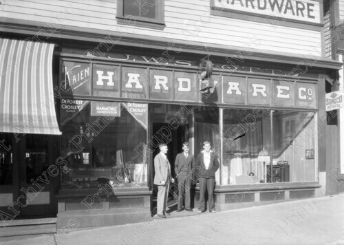 Scope & Content: Item consists of Bill Elkins, Doug Scott and another man standing outside of Kaien Hardware on the 600 Block of 3rd Avenue West. Handwritten annotation on recto of copy 2 reads: "600 - Blk. 3rd. Ave. W. Right Doug Scott. Bill Elkins. 1930." Stamped annotation on verso of copy 2 reads: "Photo by Jack Wrathall Prince Rupert, B. C."