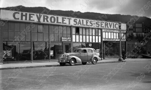 Scope & Content: Item consists of the exterior of Kaien Motors, Chevrolet Sales and Service on 3rd Avenue and 7th Street. The office of Sun Life Assurance can also be seen. Handwritten annotation on recto of copy 2 reads: "3rd. Ave. & 7th. St. 1937." Stamped annotation on verso of copy 2 reads: "Photo by Jack Wrathall Prince Rupert, B. C."