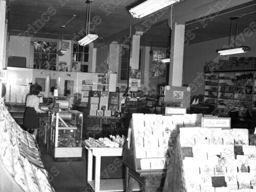 Scope & Content: Item consists of the interior of McRae Brothers Store at 327 3rd Avenue West. Someone can be seen working at a desk on the upper level. Handwritten annotation on recto of copy 2 reads: "McRae Bros. 300 Blk. 3rd. Ave. W. 1946." Stamped annotation on verso of copy 2 and 3 reads: "Photo by Jack Wrathall Prince Rupert, B. C."
