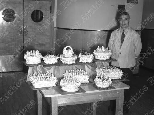 Scope & Content: Item consists of a man standing beside a food tray at the Hollywood Cafe at 727 3rd Avenue West on its opening day. Handwritten annotation on recto of copy 2 reads: "Hollywood Cafe. Opening Day. 727 - 3rd. Ave. W. 1946." Handwritten annotation on recto of copy 3 reads: "Hollywood Cafe. Henry 700 Blk. 3rd. Ave. 1946." Stamped annotation on verso of copies 2 and 3 reads: "Photo by Jack Wrathall Prince Rupert, B.C."