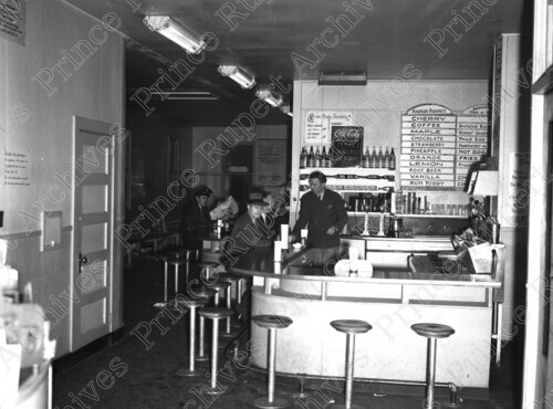 Scope & Content: Item consists of the interior of a Bus Line (Arrow Bus Lines?) Cafe, located at 2nd Street and 2nd Avenue West in Pr. Rupert with staff member and customers at the lunch counter. Handwritten annotation on recto of copy 2 reads: "Interior. Bus Line. Cafe. 200 Blk. 2nd. St. & 2nd. Ave. Pr. Rupert. 1947." Handwritten annotation on recto of copy 3 reads: "Bus Terminal - 2nd. Ave. & 2nd St. 1947." Stamped annotation on verso of copies 2 and 3 reads: "Photo by Jack Wrathall Prince Rupert, B. C."