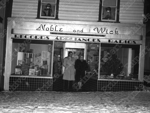 Scope & Content: Item consists of Dan Wick and Audrey Wrathall standing outside of Noble and Wick Records, Appliances and Radios at 201 3rd Avenue West. Handwritten annotation on recto of copy 2 reads: "201 - 3rd. Ave. 1948." Handwritten annotation on recto of copy 3 reads: "Bill Noble- Dan Wick. Dan Wick - Audrey Wrathall. 201 - 3rd. Ave. W. Pr. Rupert. 1948." Stamped annotation on verso of copies 2 and 3 reads: "Photo by Jack Wrathall Prince Rupert, B. C."
