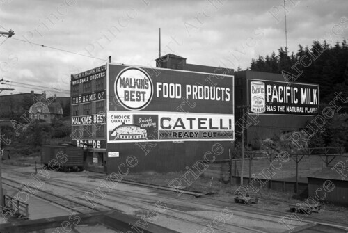 Scope & Content: Item consists of a view of the W.H. Malkin Co. Ltd., C.N. tennis courts, a glimpse of Pillsbury House and CN Railway tracks. Handwritten annotation on recto of copy 2 reads: "C.N. Tennis Court. W.H. Malkin Co. Ltd. 1948. Pr. Rupert." Stamped annotation on verso of copy 2 reads: "Photo by Jack Wrathall Prince Rupert, B. C."