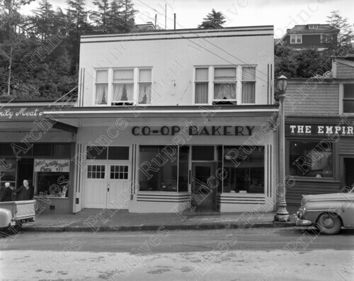 Scope & Content: Item consists of the exterior of Jones Family Meat Market, Co-op Baker and the Empire newspaper office on 3rd Avenue West. Homes can be seen above on 4th Avenue West. Handwritten annotation on recto of copy 2 reads: "1950. Jones Family Meat Market. 300 Blk 3rd. Ave. W." Handwritten annotation on recto of copy 3 reads: "337 - 3rd. Ave. W. Pr. Rupert. 1951." Stamped annotation on verso reads: "Photo by Jack Wrathall Prince Rupert, B. C."