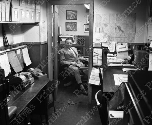 Scope & Content: Item consists of Hugo Kraupner sitting at a desk in Ideal Cleaners on the 300 Block of McBride Street. Kraupner was the proprietor of Ideal Cleaners. Handwritten annotation on recto of copy 2 reads: "Ideal Cleaners. 300 - Blk - McBride St. Hugo Kraupner. Prop." Handwritten annotation on recto of copy 3 reads: "Hugo Kraupner. Ideal Cleaners. 300 Blk. McBride St. 1951." Stamped annotation on verso of copies 2 and 3 reads: "Photo by Jack Wrathall Prince Rupert, B. C."