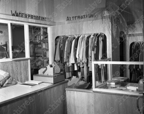 Scope & Content: Item consists of the interior of Ideal Cleaners on the 300 block of McBride Street. Clothing can be seen hanging behind the counter and a view to back room can also be seen. Handwritten annotation on recto of copy 2 reads: "Ideal Cleaners. 300 Blk. McBride. St." Stamped annotation on verso of copy 2 reads: "Photo by Jack Wrathall Prince Rupert, B. C."