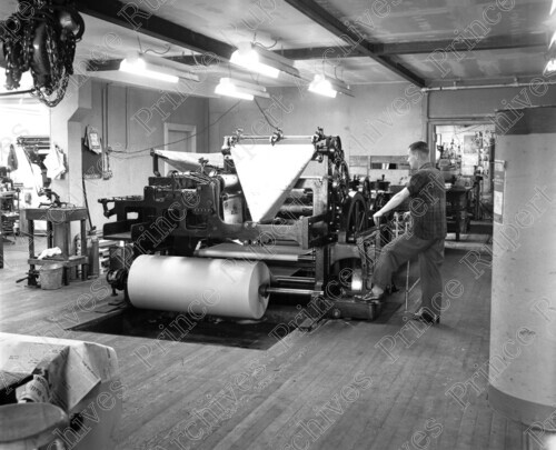 Scope & Content: Item consists of employee standing at printing machine in back of Prince Rupert Daily News office on the 200 block of 3rd Avenue West. Handwritten annotation on recto of copy 2 reads: "200 Blk. 3rd. Ave W. 1951. Daily News." Handwritten annotation on recto of copy 3 reads: "Printing Press. P.R. Daily News. 1951." Stamped annotation on verso of copy 3 reads: "Photo by Jack Wrathall Prince Rupert, B. C."