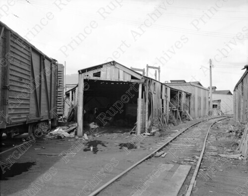 Scope & Content: Item consists of the exterior of buildings near the CN Railway tracks and rail cars including Albert & McCaffery's in Cow Bay. Handwritten annotation on recto of copy 2 reads: "Albert & McCaffery. Coal Sheds. Cow Bay. 1952." Stamped annotation on verso of copy 2 reads: "Photo by Jack Wrathall Prince Rupert, B. C."
