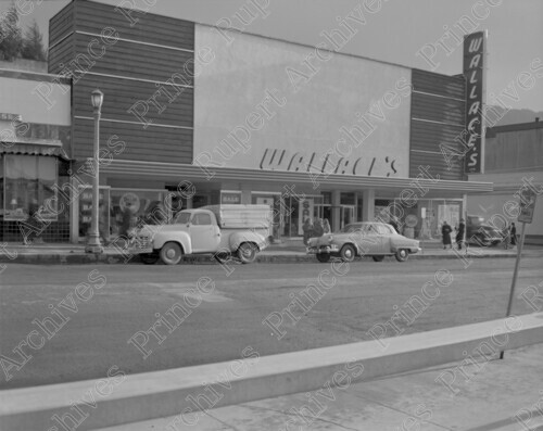 Scope & Content: Item consists of the exterior of Wallace's Department Store at the corner of 3rd Avenue West and Fulton Street. Cars can be seen parked outside the Department Store. Handwritten annotation on recto of copy 2 reads: "1953. 3rd. Ave. & Fulton St." Handwritten annotation on verso of copy 2 reads: "1955." Handwritten annotation on recto of copy 3 reads: "475 - 3rd Ave. & Fulton St. Louie Felsenthal. 1952." Stamped annotation on verso of copy 3 reads: "Photo by Jack Wrathall Prince Rupert, B. C."