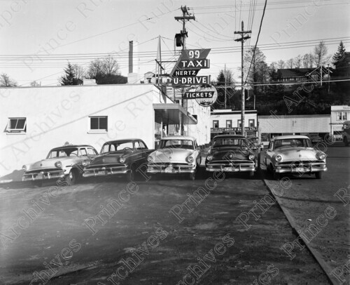 Title: 99 Taxi and Hertz U-Drive on 2nd Avenue West and 2nd Street at Prince Rupert, B.C. in 1954