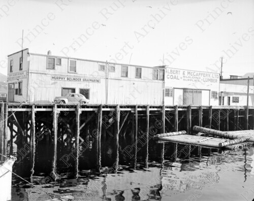 Scope & Content: Item consists of the exterior of the Albert & McCaffery Ltd. Coal & Lumber and Murphy Bolinder Graymarine Northern Engine & Equipment Co. Ltd. buildings on a wharf in Cow Bay. Handwritten annotation on recto of copy 2 reads: "Waterfront - Cow Bay. 1957." Stamped annotation on recto of copy 2 reads: "Photo by Jack Wrathall Prince Rupert, B. C."