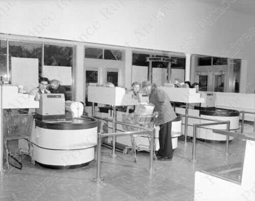 Scope & Content: Item consists of the interior of the Tom Boy Grocery Store on McBride Street and 5th Avenue during its opening day. Three cashiers and two customers can be seen inside the Store. Handwritten annotation on recto of copy 2 reads: "Opening Day. Tom Boy Store. 1957." Stamped annotation on verso of copy 2 reads: "Photo by Jack Wrathall Prince Rupert, B. C."