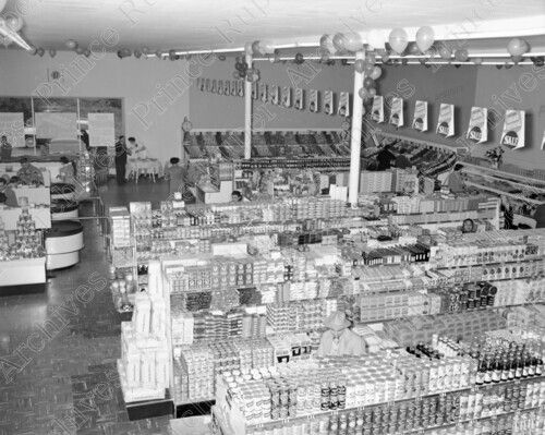 Scope & Content: Item consists of a view from the second floor of aisles in the new Tom Boy Grocery Store on McBride Street and 5th Avenue. The view includes employees and customers. Handwritten annotation on recto of copy 3 reads: "Tom Boy Store. 5th Ave. & McBride St. 1957." Stamped annotation on verso of copy 3 reads: "Photo by Jack Wrathall Prince Rupert, B. C."