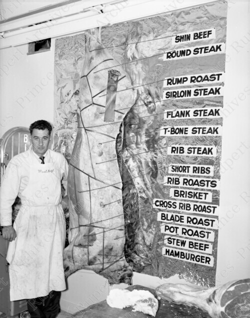 Scope & Content: Item consists of a man standing inside the Co-op Butcher Shop next to a display of meat with labels indicating the various cuts of meat. Handwritten annotation on recto of copy 2 reads: "P.R. Co-op. 100 Blk. 3rd. Ave. W. 1958." Stamped annotation on verso of copy 2 reads: "Photo by Jack Wrathall Prince Rupert, B. C."