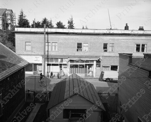 Scope & Content: Item depicts the view from above looking towards 500 Block of Fulton Street and 6th Avenue West including the Quality Food Store. A Mrs. Pettenuzzo and others can be seen out front. Handwritten annotation on recto of copy 2 reads: "500 Blk. Fulton St. Quality Food Store. Mrs. Pettenuze [sic]. 1959." Handwritten annotation on recto of copy 3 reads: "1959. Fulton Street & 6th Ave." Stamped annotation on verso of copies 2 and 3 reads: "Photo by Jack Wrathall Prince Rupert, B. C."