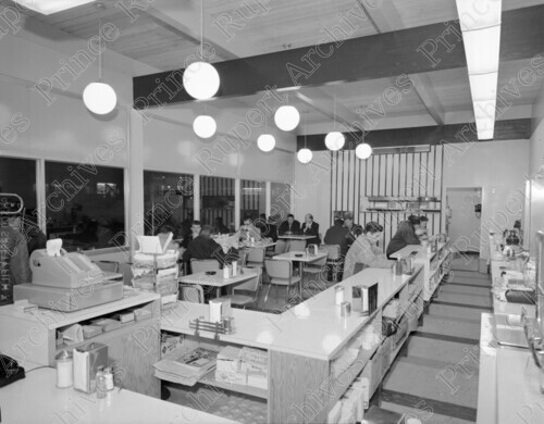Scope & Content: Item consists of the interior of the Seaway Restaurant in the Rupert Bus Line terminal on 2nd Avenue West and 7th Street. Customers can be seen at the counter and tables. The proprietor of the Seaway Restaurant was Bill Denlock. Handwritten annotation on recto of copy 2 reads: "1965. Seaway Restaurant [sic]. Bill Denlock Prop. In Rupert Bus Line Bldg. 2nd. Ave. & 7th St." Stamped annotation on verso of copies 2 and 3 reads: "Photo by Jack Wrathall Prince Rupert, B. C."