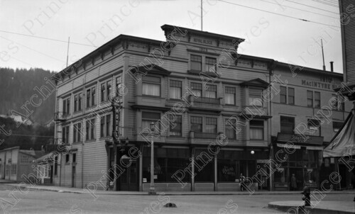 Title: Corner of 3rd Avenue & 6th Street Including the Royal Hotel and Frizzell's Meat Market at Prince Rupert, B.C. in 1930