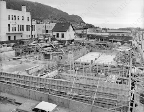Scope & Content: Item consists of the construction site for a new federal building on the 400 block of 2nd Avenue West. The back of the old federal building and the Canadian Bank of Commerce can be seen in the background. The federal building would house the post office. Handwritten annotation on recto of copy 3 reads: "Building New Federal Post Office. 400 Blk. 2nd. Ave. W. 1962." Stamped annotation on verso of copies 2 and 3 reads: "Photo by Jack Wrathall Prince Rupert, B. C."