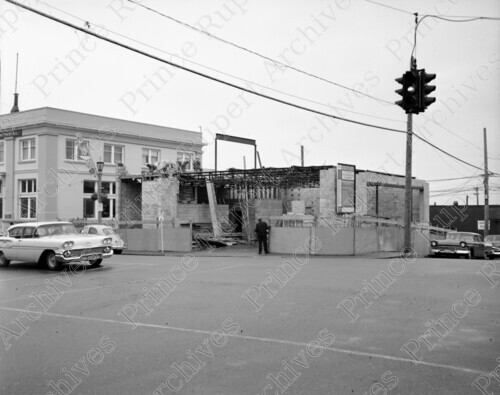 Scope & Content: Item consists of the construction site of a new Canadian Bank of Commerce and the Bank of Montreal building beside it on 3rd Avenue West. Handwritten annotation on recto of copy 2 reads: "Building New Canadian Bank of Commerce. 3rd Ave. & 4th St. 1961." Stamped annotation on verso reads: "Photo by Jack Wrathall Prince Rupert, B. C."