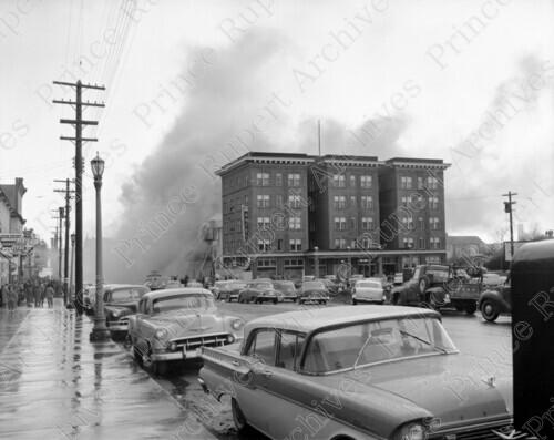 Title: Stork Block Fire on the 700 Block of 2nd Avenue West, showing the Prince Rupert Hotel next door at Prince Rupert, B.C. in 1957