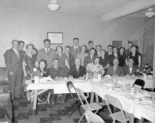 Scope & Content: Item consists of 24 staff and guests gathered around a table at a party at Imperial Oil. Co. in Cow Bay. Pictured from left to right seated is: Winnie Kristmanson, Dan Kristmanson, John Feness, Edna Feness, Gus Fraser and Dudley Foster. Pictured standing from left to right is: Jim Currie, Sandy Storrie, Sig Currie, Teeny Dell, Vic Dell, Toots Christison, Eric Christison, Ralph Pay, Mrs. Pay, Rupe Holkestad, Les Reekie, Betty Holkestad, Sara Hartwig, Floyd Hercomer, Evan Shier, Kay Reekie, Elmer Hartwig and Mabel Shier. Handwritten annotation on recto of copy 2 reads: "Mr & Mrs Sam Currie. Mr & Mrs Eric Christianson. 1953. Imperial Oil Part. Mr & Mrs Dan Kristmanson." Handwritten annotation on verso of copy 2 reads: "Mr & Mrs Brick Hartwig." Handwritten annotation on recto reads: "Guests & Staff Party, Imperial Oil Co. 1953." Stamped annotation on verso reads: "Photo by Jack Wrathall Prince Rupert, B. C."