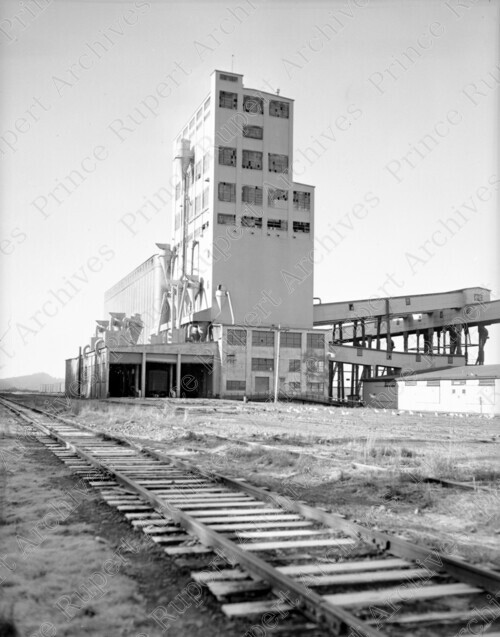 Scope & Content: Item consists of the exterior of the Canadian Government Grain Elevator and CN Railway tracks on the waterfront. Handwritten annotation on recto of copy 2 reads: "1957. Rupert Elevator."