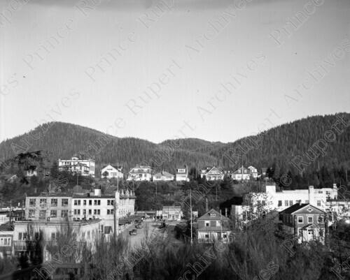 Scope & Content: Item consists of a view from Totem Hill of 3rd Street, 2nd Avenue West and 4th Avenue West. The view includes Besner Block, Northland Dairy, the federal building, the Museum of Northern B.C., St. Joseph's Convent, Linzey & Davies and houses. The federal building housed the post office. Handwritten annotation on recto of copy 3 reads: "Prince Rupert 1950. 3rd. St. & 3rd. Ave. 4th. Ave. Background. Besner Blk. Northland Dairy. Post Office. Museum." Stamped annotation on verso of copies 2 and 3 reads: "Photo by Jack Wrathall Prince Rupert, B. C."