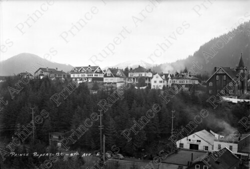 Scope & Content: Item consists of a view of 3rd Avenue East including S.E. Parker Limited and homes and the First Presbyterian Church above on 4th Avenue East. Handwritten annotation on recto of copies 1 and 2 reads: "Prince Rupert - 4th Ave. E." Handwritten annotation on recto of copy 2 reads: "1950." Stamped annotation on verso of copy 2 read: "Photo by Jack Wrathall Prince Rupert, B. C."