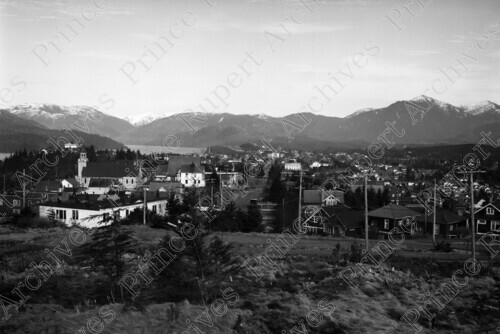 Scope & Content: Item consists of a view of town from Roosevelt Park looking East toward Summit Avenue and 6th Avenue West. The view includes King Edward School and Annunciation Catholic Church. Handwritten annotation on recto of copy 2 reads: "6th Ave. W. End of 6th. Booth Mem. School. Summit Apts. Taylor St & Summit Ave. 1950." Handwritten annotation on recto of copy 3 reads: "Prince Rupert, B.C. Summit Apts. Catholic Church. 1948." Stamped annotation on verso of copies 2 and 3 reads: "Photo by Jack Wrathall Prince Rupert, B. C."