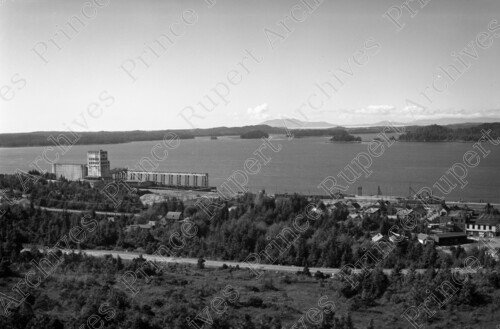 Title: Harbour View Including the Grain Elevator Elevator, Morse Creek Bridge and Water Street at Prince Rupert, B.C. in 1948