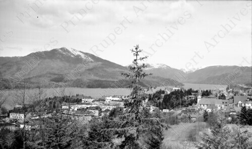 Scope & Content: Item consists of a view of downtown from Roosevelt Park, looking east and west. Mount Morse can be seen in the background. Handwritten annotation on recto of copy 2 reads: "P. Rupert. 1949." Stamped annotation on verso of copy 2 reads: "Photo by Jack Wrathall Prince Rupert, B. C."