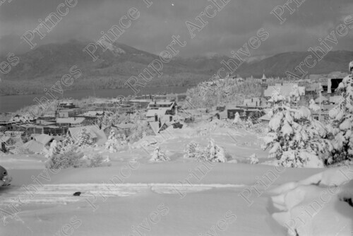 Scope & Content: Item consists of a view of downtown in the snow from Roosevelt Park. Annunciation Catholic Church on 5th Avenue West and Musgrave Place can be seen on the right. Mount Morse can be seen in the background. Handwritten annotation on recto of copy 2 reads: "Winter - From Roosevelt Park. 1938. Pr. Rupert, B.C." Stamped annotation on verso of copy 2 reads: "Photo by Jack Wrathall Prince Rupert, B. C."