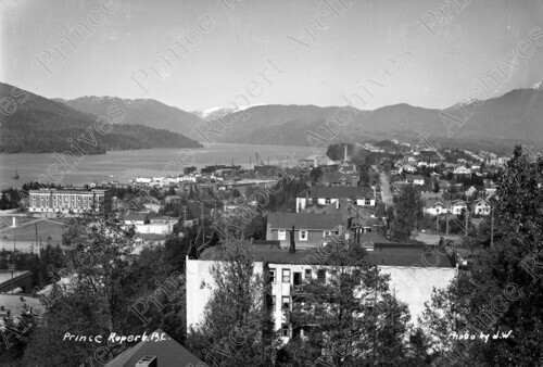 Scope & Content: Item consists of a view from St. Joseph's Convent of 3rd Avenue West, the Waldren Apartments, First Presbyterian Church on 4th Avenue East, the Prince Rupert Courthouse on Market place, the Prince Rupert Dry Dock and the harbour. Handwritten annotation on recto of copies 1 and 2 reads: "Prince Rupert. B.C. Photo by J.W." Handwritten annotation on recto of copy 2 reads: "Courthouse. Waldron [sic] Apts. 1947."