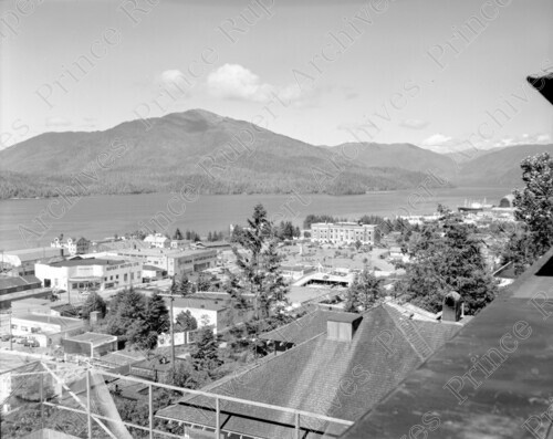 Scope & Content: Item consists of a view from the top of St. Joseph's Convent on 4th Avenue West of 1st and 2nd Avenue West and McBride Street. The view includes Rupert Motors Ltd, the Prince Rupert Courthouse, a sawmill and Chatham House. Handwritten annotation on recto of copy 2 reads: "Navy Drill Hall. Chatham house. Civic Centre. Court House. 1963." Handwritten annotation on recto of copy 3 reads: "from Convent. 4th. Ave. W. 1963." Stamped annotation on verso of copies 2 and 3 reads: "Photo by Jack Wrathall Prince Rupert, B. C."