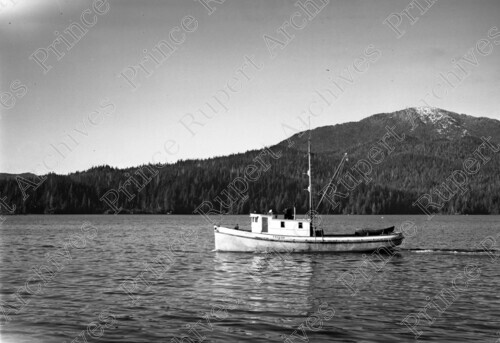 Scope & Content: Item is a view of the halibut boat "Chief Tapeet" in the Prince Rupert harbour. Mount Morse can be seen in the background. Handwritten annotation on recto of copy 2 reads: "Chief [sic]. 1945. Tapeet." Stamped annotation on verso of copy 2 reads: "Photo by Jack Wrathall Prince Rupert, B. C."