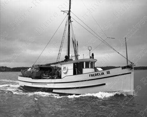 Scope & Content: Item consists of the halibut boat "Fredelia III" in the Prince Rupert harbour. Handwritten annotation on recto of copy 2 reads: "1952. Mr. Husoy. Then Bill Husoy - Brother." Stamped annotation on verso of copy 2 reads: "Photo by Jack Wrathall Prince Rupert, B. C."