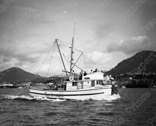 Scope & Content: Item consists of seiner "Haida Warrior" in the Prince Rupert harbour. The Cow Bay waterfront can be seen in the background. Handwritten annotation on recto of copy 2 reads: "Haida Warrior. Ernie Hill." Stamped annotation on verso of copy 2 reads: "Not to be Reproduced or Published Without Authority of Wrathall's Photo Finishing Prince Rupert, B. C. Photo by Jack Wrathall Prince Rupert, B. C." Handwritten annotation verso of copy 3 reads: "1957. Geoffrey White Capt."