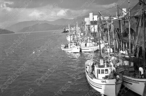 Scope & Content: Item consists of a halibut fleet at a fish dock. The fleet includes the "Ionic," "Leviathan" and the "Liberty-Ketchikan." Handwritten annotation on recto of copy 2 reads: "Halibut Fleet at Fish Dock. Pr. Rupert. 1947." Stamped annotation on verso of copy 2 reads: "Photo by Jack Wrathall Prince Rupert, B. C."