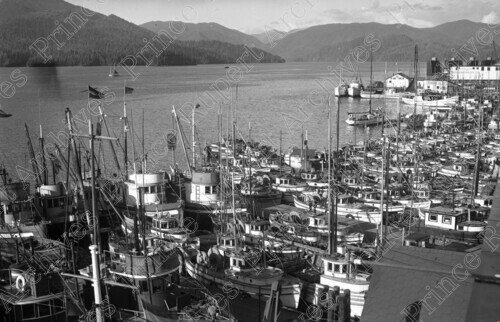 Scope & Content: Item consists of a fishing fleet at Cow Bay. A Standard Oil building the Prince Rupert Drydock and BC Packers can be seen in the background. Handwritten annotation on recto of copy 2 reads: "1949- Gillnet Fleet - Cow Bay." Stamped annotation on verso of copy 2 reads: "Photo by Jack Wrathall Prince Rupert, B. C."