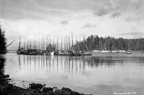Title: Fishing Fleet at Qlawdzeet Near Stephens Island, B.C. in 1937