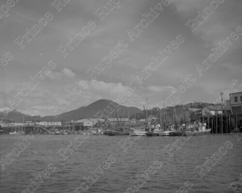 Scope & Content: Item consists of a view from the harbour of the waterfront in Cow Bay, Albert & McCaffery, Standard Oil, Edward Lipsett, Burns & Co. Ltd., and boats at the Prince Rupert Yacht Club. Homes can be seen in the background on a hill. Handwritten annotation on recto of copies 2 and 3 reads: "Standard Oil - Edward Lipset [sic] - Burns. Co. Ltd - Yacht Club - Cow Bay. 1952." Stamped annotation on verso of copies 2 and 3 reads: "Photo by Jack Wrathall Prince Rupert, B. C. 1952."